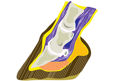 Laminitis results from the disruption (constant, intermittent or short-term) of blood flow to the sensitive and insensitive laminae. These laminae structures within the foot secure the coffin bone (the wedge-shaped bone within the foot) to the hoof wall. Inflammation often permanently weakens the laminae and interferes with the wall/bone bond. In severe cases, the bone and the hoof wall can separate. In these situations, the coffin bone may rotate within the foot, be displaced downward ("sink") and eventually penetrate the sole. Laminitis can affect one or all feet, but it is most often seen in the front feet concurrently.
